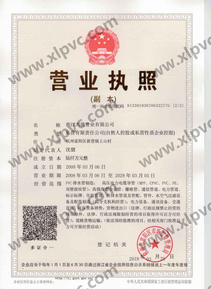 浙江興隆管業(yè)有限公司位于杭州市富陽(yáng)區(qū)(杭州第九新區(qū)),坐落在新登鎮(zhèn),相距杭州僅60公里,水、陸、空交通運(yùn)輸十分便利。浙江興隆管業(yè)有限公司前身為富陽(yáng)興隆塑料制品廠(chǎng),成立于1992年,2008年改名浙江興隆管業(yè)有限公司,數(shù)十年來(lái),公司一直至力于管道的生產(chǎn),目前公司擁有國(guó)內(nèi)先進(jìn)的CPVC保護(hù)管生產(chǎn)線(xiàn),HPVC()雙壁波紋管生產(chǎn)線(xiàn),多孔管生產(chǎn)線(xiàn),玻璃鋼電纜保護(hù)管生產(chǎn)線(xiàn)、MPP電纜保護(hù)管生產(chǎn)線(xiàn)。生產(chǎn)的主要產(chǎn)品有:CPVC電纜保護(hù)管、MPP電力電纜保護(hù)管(頂管)、高強(qiáng)度塑合金管、HDPE給排水管、HPVC()雙壁波紋管、玻璃鋼電纜保護(hù)管、埋地通信用的PVC-U多孔管、PE直壁管、PVC-U雙壁波紋管、梅花管等,年生產(chǎn)能力達(dá)20000萬(wàn)米。
